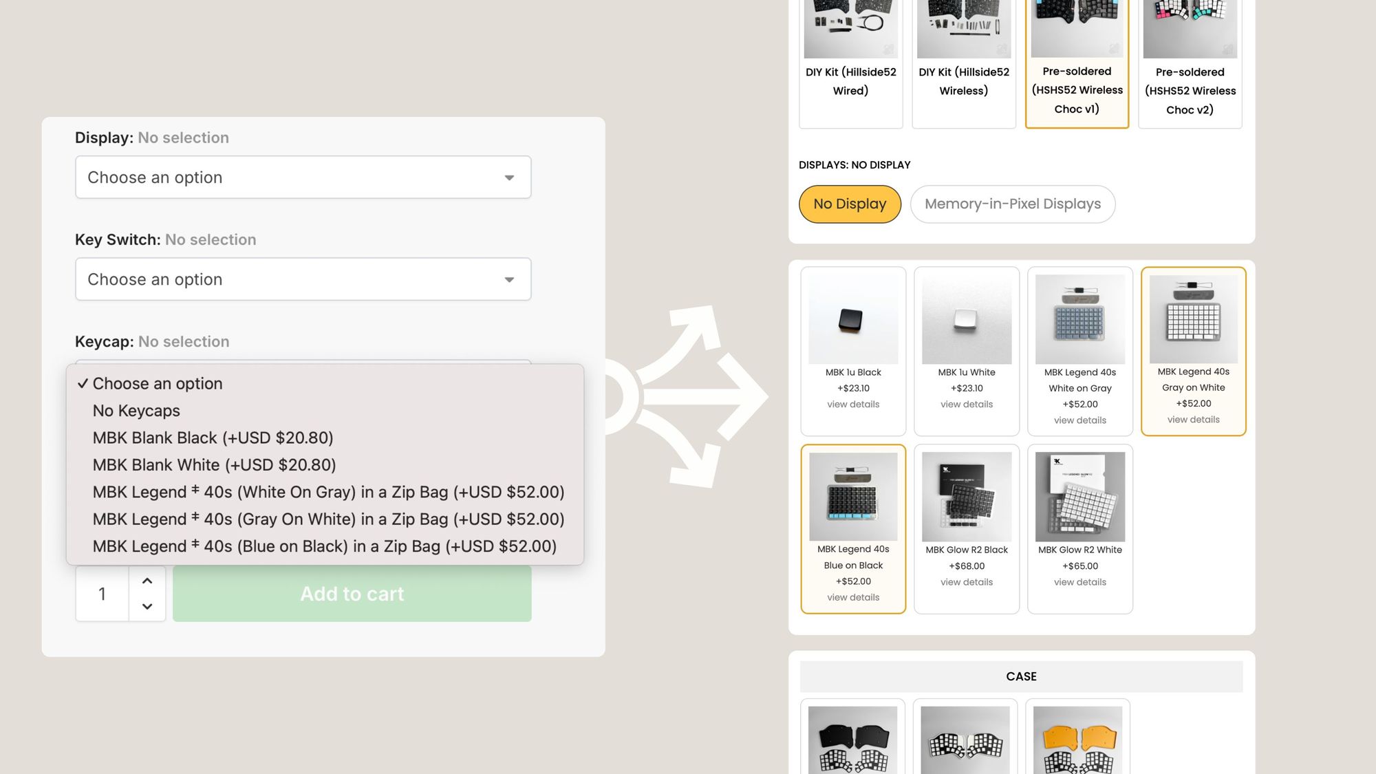 Now, all the key switches, keycaps, and case options include clear thumbnail photos so you can see exactly what you’re picking before you make your choice. When you select them on the same page for a DIY Keyboard Kit or Pre-soldered Keyboard, we guarantee that everything will work together perfectly.