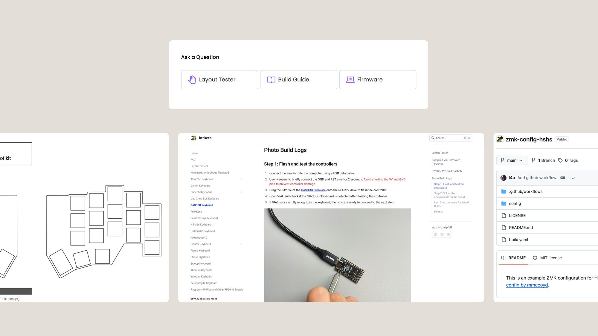We would suggest using the layout tester. Print the keyboard layout on an A5 paper, place it on a table, adjust the angle, and test whether your fingers can comfortably reach all the keys. We also often get asked about the firmware used in the keyboards and the related build guides.