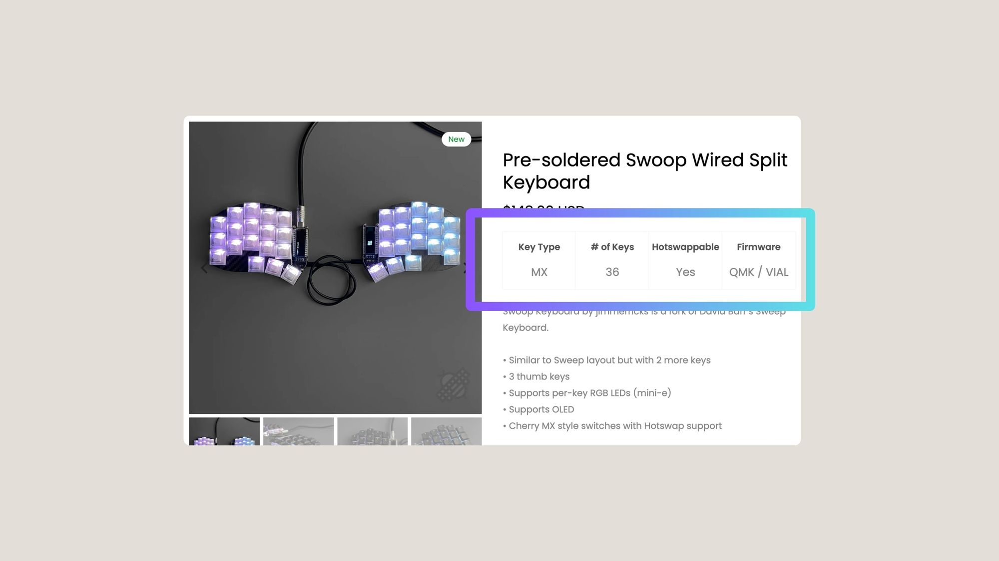 Every keyboard is designed differently to suit the size and shape of your hand and your personal needs. However, some common factors are important when choosing a keyboard. These include the switch type, the number of keys, whether the switches are hotswappable, and the open-source firmware it uses. This information is now clearly displayed right below the product name in a block. You no longer need to search, guess, or feel confused about the keyboard you want to buy.