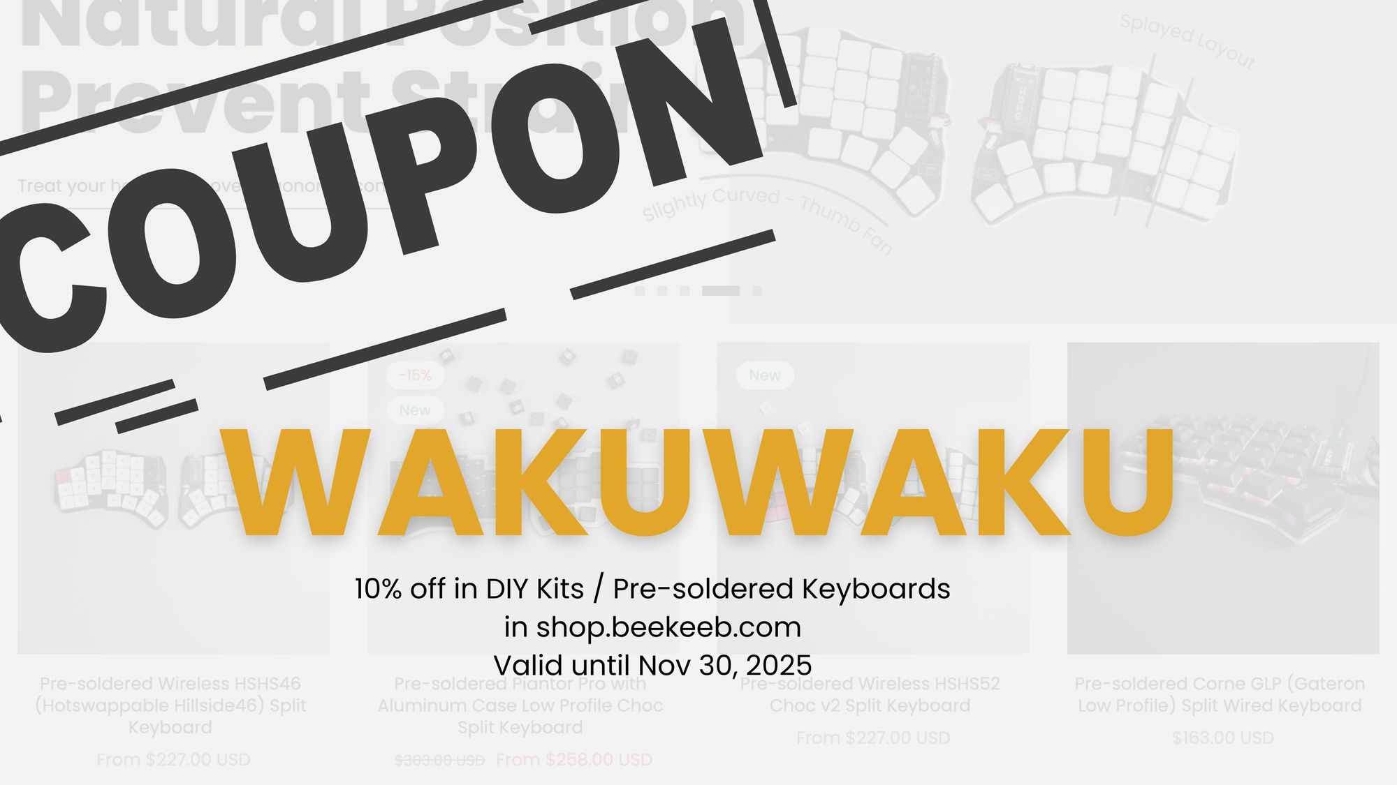 , valid until November 30, 2025. (Tips: you can even combine this coupon with existing sales on kits and keyboards to save even more.) Please use the coupon in https://shop.beekeeb.com when you checkout the cart.